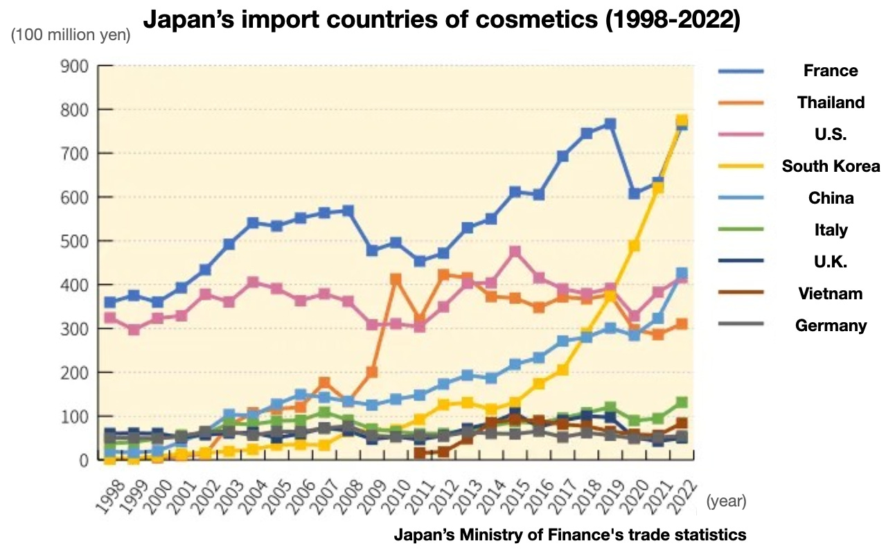 日本富士株式会社の市場調査によると、日本の化粧品市場の総推定価値は2022年と比較して3.3%増加し、3兆2760億円に達したと昨年9月に報告されました。日本の中国からの輸入量(約400億円)は、2021年と2022年にそれぞれタイとアメリカを上回りました。